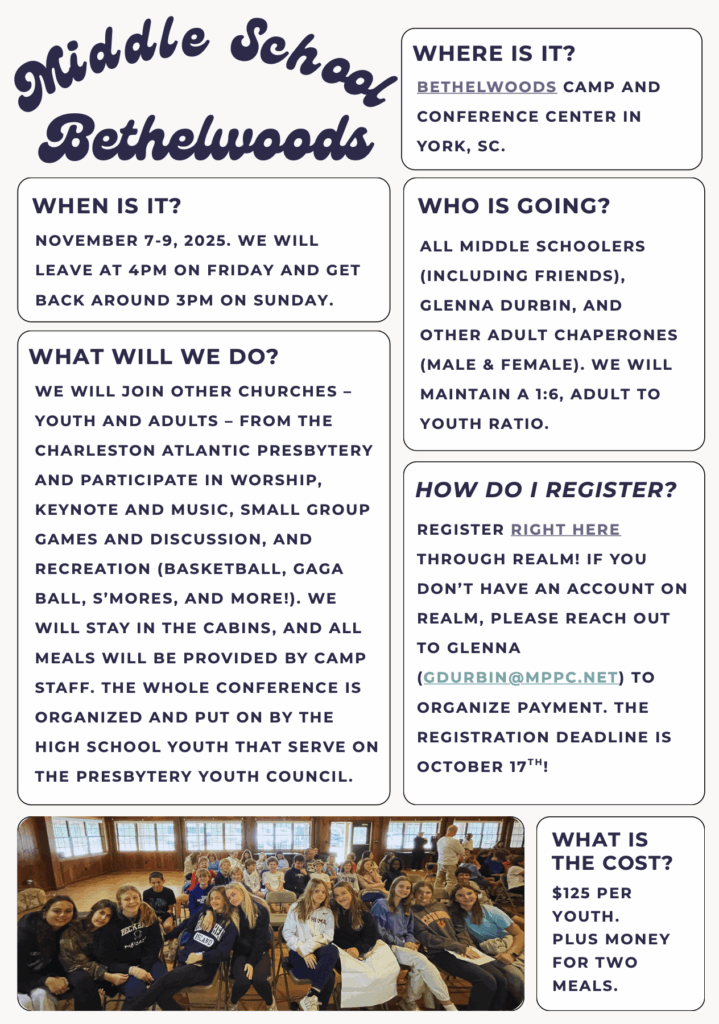 Join us Nov. 7-9 at Bethelwoods Camp and Conference Center in York, SC. During this weekend retreat, put on by the presbytery we will join other churches from our area in worship, keynote, small, group, and recreation and have tons of fun! For more information see the Middle School Bethelwoods Flyer.